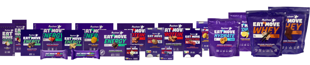 Boostez vos performances avec Auchan Eat'N Move ! Notre gamme de produits alimentaires est conçue pour soutenir votre corps dans tous vos efforts sportifs. Des ingrédients naturels, une nutrition équilibrée et un goût délicieux, l'allié de tous les sportifs.
